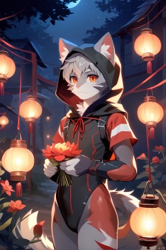 solo, short hair, 1boy, holding, animal ears, standing, tail, flower, grey hair, male focus, cowboy shot, outdoors, cat ears, hood, orange eyes, night, glowing, red flower, furry, lantern, holding flower, furry male, body fur, white fur, cat boy, grey fur,body fur,anthro, (black sleeveless ((red stripes) bodysuit)),