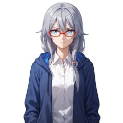 (white background:1.2),looking at viewer,(SOLO:1.4),outline,simple background,upper body, cowboy shot,looking at viewer,(((arms at side))),  fu hua, fu hua mangaver, long hair, bangs, hair between eyes, blue eyes, hair ornament, low-tied long hair, grey hair, blue hair, shirt, jacket, white shirt, long sleeves, blue jacket, glasses<lora:hood-pony:0.8>