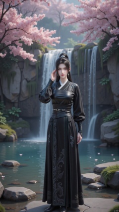 One girl, solo. Standing in front of the waterfall. Bright colors, gradient posture, black hair, bangs, hair accessories. Earrings, black ancient costume. The clothes are embroidered with silver white patterns. Silk material clothing, long sleeves, black leather waistband. Pale face, snow-white skin, blue eyes. Black canvas high boots. Perfect body proportions, slim. Tall. Touch your head with your left hand and cross your waist with your right hand.