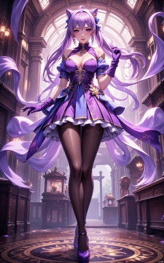 keqing\(hubggirl)\, full body shot:1.45, 21yo girl, solo, looking at viewer, indoors, (upper body, very long legs, narrow waist, grin:1.25), (wide shot, wide angle, from below, cow shot), (purple hair, bangs, cone hair bun, double bun, hair flower, hair ornament, twintails, purple_eyes:1.25), bare shoulders, large breasts, purple dress, detached_sleeves, purple gloves, short sleeves, (black pantyhose, purple high_heels), jewelry, earrings, HDR, Vibrant colors, surreal photography, highly detailed, masterpiece, ultra high res, high contrast, mysterious, cinematic, fantasy, bright natural light,