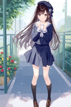 1girl, beret, black_legwear, brown_footwear, flower, full_body, hair_ornament, hat, loafers, long_hair, long_sleeves, looking_at_viewer, open_mouth, school_uniform, shoes, skirt, solo, standing, tachi-e, clear_bg