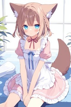1girl, animal_ear_fluff, animal_ears, blue_eyes, blush, braid, brown_hair, dress, frills, short_hair, sitting, solo, tail