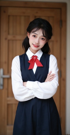 xhhieu,(best quality,4k,8k,highres,masterpiece:1.2),ultra-detailed,(realistic,photorealistic,photo-realistic:1.37),A person standing,white shirt,dark blue dress,red tie,wooden door,beautiful detailed eyes,beautiful detailed lips,extremely detailed eyes and face,long eyelashes,confident expression,standing straight,professional attire,slight smile,indoor setting,soft natural light,cozy atmosphere,modern interior,neutral background,subtle shadows,rich textures,sharp focus,physically-based rendering,portrait,calm and composed,earth tones,gentle highlights,vivid colors,bokeh