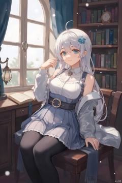 1girl,solo,blue eyes,white hair,(long hair),hair between eyes,medium breasts,white_shirt,frilled collar,pleated skirt,long sleeves,brooch,snowflake hair_ornament,waistcoat,black leggings,(open jacket),shoulder cutout,hair ribbon,sitting,looking at viewer,(jitome),half-closed eyes,[light_smile],depth of field,indoors,bookshelf,bookcase,counter,(french window),pendant lamp,open book,sunlight,light particles,masterpiece,bestquality,[Artist miwano rag],[Artist toosaka asagi],[Artist wlop],[Artist chen bin],[iumu],omochi_monaka,,TrNyteal