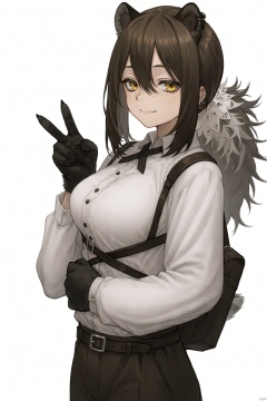 1girl, solo, long hair, breasts, looking at viewer, smile, simple background, brown hair, shirt, long sleeves, white background, animal ears, hair between eyes, closed mouth, yellow eyes, white shirt, upper body, ponytail, cowboy shot, collared shirt, belt, hand up, v, piercing, polka dot, ear piercing, freckles, animal hands, raccoon ears, raccoon girl, cross tie,half-closed eyes