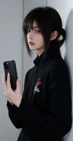 aoinll,(black outfit,embroidered chest,long hair,hair accessory,holding smartphone,black case,plain background,light-colored background),(best quality,4k,8k,highres,masterpiece:1.2),ultra-detailed,(realistic,photorealistic,photo-realistic:1.37),beautiful detailed eyes,beautiful detailed lips,extremely detailed eyes and face,long eyelashes,modern style,slim figure,confident expression,smart casual,side view,standing pose,soft lighting,studio lighting,subtle shadows,smooth skin,high contrast,sharp focus,physically-based rendering,extreme detail description,professional,vivid colors,bokeh,clean and simple composition,contemporary fashion,portraits,fine art photography