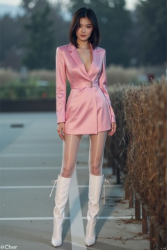 plns,1girl,pretty,solo,glamor,asian,charming,pink dress,white pantyhose,glossy pantyhose,white kneeboots,standing,full body,model pose,outdoors, romantic realism, atmospheric, perfect background, The '@Cher' script in the lower right corner adds an artistic touch to this visually stunning portrait bathed in BJ's Rainbow light, showcasing natural lighting that highlights every detail in high-quality realism.cher,plsw,beauty