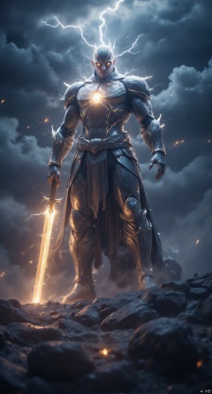 A sweeping shot from below, emphasizing the colossal scale of the electric giant as it rises like a titan above the turbulent landscape. The camera captures its fierce gaze, blazing with power as it readies its thunderous sword, surrounded by an aura of crackling energy that illuminates the darkening sky. The dynamic pose is set against a dramatic backdrop of swirling storm clouds, punctuated by flashes of lightning that seem to synchronize with the giant's thunderous roar, casting a fiery glow across the tempestuous horizon.