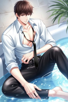 A solo anime-style male sits looking directly at the viewer, his short brown hair messy and styled to perfection. He wears a white collared shirt with no tie, showcasing his defined abs and pectorals as he sits with one knee up and his bare feet visible. His black necktie hangs loose around his neck, adding a touch of sophistication. The background is an indoor setting with a bathtub and water effects creating a see-through illusion. The subject's black pants are wet, and his white shirt clings to his torso, highlighting his navel. Brown eyes lock onto the viewer, inviting them into this intimate moment.
