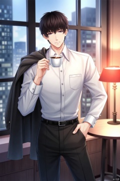A solo shot of a young man with short, black hair and a white shirt, standing confidently in front of a window with a cityscape view. He's wearing black pants and has his jacket slung over one shoulder, holding a cup of steaming hot coffee in his hand. The warm glow of the lamp on the nearby table casts a cozy ambiance, highlighting the texture of his hair and the creases of his shirt.