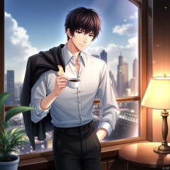 A solo shot of a young man with short, black hair and a white shirt, standing confidently in front of a window with a cityscape view. He's wearing black pants and has his jacket slung over one shoulder, holding a cup of steaming hot coffee in his hand. The warm glow of the lamp on the nearby table casts a cozy ambiance, highlighting the texture of his hair and the creases of his shirt.