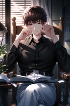 A young anime-style boy, with short brown hair and a closed mouth expression, sits alone in a dimly lit room. He's dressed in a collared black shirt, white pants, and a belt, his long sleeves rolled up slightly. His eyes gaze directly at the viewer as he reads from an open book, one hand resting on his face and the other holding it up to block the sunlight streaming through the blinds. A lamp casts a warm glow on the table beside him, where a plant sits amidst scattered pages. The chair creaks softly under his weight, as he crosses his legs and remains still, immersed in his reading.