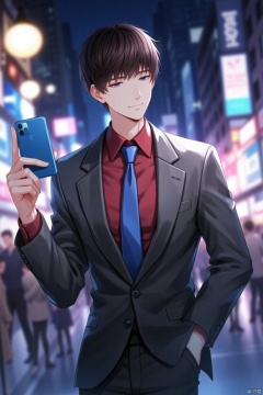 a cartoon character, dressed in a gray blazer, a red button-down shirt, a blue tie, and black pants, is holding a blue cell phone in his right hand. His left hand is resting on his hip. The character's eyes are closed, as if he is looking down at the phone. The background is blurred, suggesting a cityscape. The scene is lit up with a few lights, adding a pop of color to the scene.