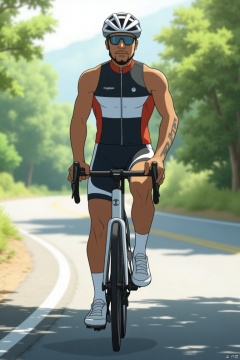 1man,solo,asian,muscular,handsome,Bicycle athlete,riding. bike clothes,white socks,white footwear. Others:snapshot,road,scenery,bright,masterpiece,realistic,best quality,highly detailed,highres,jzns.,,POKTY