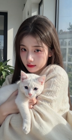 ,zzshanghanghirley,(best quality,4k,8k,highres,masterpiece:1.2),ultra-detailed,(realistic,photorealistic,photo-realistic:1.37),a girl holding a white cat,near window,beautiful detailed eyes,beautiful detailed lips,extremely detailed eyes and face,long eyelashes,white fur,soft lighting,indoor scene,cozy atmosphere,relaxed expression,comfortable clothes,casual pose,gentle gaze,calm demeanor,modern interior,large windows,soft shadows,subtle highlights,soft focus,photography,neutral colors,soft pastel tones,serene ambiance,gentle sunlight,soft textures,high detail,sharp focus,physically-based rendering,vivid colors,bokeh