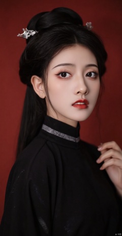 lqniniuai,(black traditional outfit,high collar,long dark hair,elegant updo,decorative hairpin,solid red background),(best quality,4k,8k,highres,masterpiece:1.2),ultra-detailed,(realistic,photorealistic,photo-realistic:1.37),beautiful detailed eyes,beautiful detailed lips,extremely detailed eyes and face,long eyelashes,traditional hairstyle,refined makeup,graceful posture,side profile,serene expression,rich fabric texture,subtle shadows,soft lighting,high contrast,deep red tones,dramatic atmosphere,portrait photography,studio lighting,sharp focus,vivid colors,bokeh,