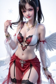 1girl, solo, long hair, breasts, looking at viewer, blue eyes, skirt, black hair, hair ornament, thighhighs, navel, jewelry, detached sleeves, wings, midriff, black thighhighs, necklace, red skirt, garter straps, snowflakes