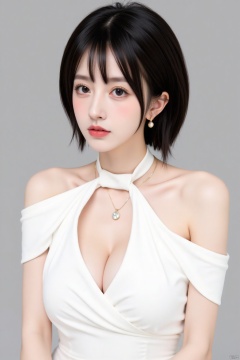 1girl, solo, breasts, looking at viewer, short hair, simple background, black hair, dress, cleavage, bare shoulders, medium breasts, collarbone, upper body, earrings, parted lips, necklace, white dress, black eyes, lips, halterneck, realistic