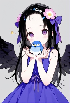 High Elite loli 1girl long hair solo bangs pinned back black hair black wings dress happy birthday wings purple eyes purple dress looking at viewer covered mouth hair ornament feathered wings hair bow bow very long hair forehead covering own mouth ribbon purple ribbon hair flower flower grey background purple bow hugging tail hands up bird wings hair ribbon english text upper body animal holding blue ribbon entangled simple background sleeveless dress bird cowboy shot string,