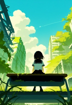 loli, 1girl, overgrown, ruins, school desk, desk, sky, cloud, solo, scenery, outdoors, school chair, sitting, chair, day, school uniform, blue sky, grass, socks, black hair, moss, sailor collar, serafuku, black socks, kneehighs, from behind, shirt, short sleeves, signature, white shirt, on desk, cloudy sky, vines, plant, shoes, classroom, facing away, from below, cumulonimbus cloud, wide shot, blurry foreground, short hair, blurry, sitting on desk, blue sailor collar, black sailor collar, depth of field, sunlight, post-apocalypse, railroad tracks, skirt, summer, medium hair, black footwear, loafers, arms at sides, rust