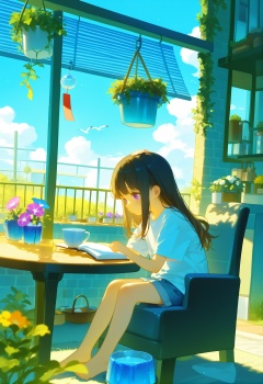 loli, 1girl, animal on lap, sitting, on lap, chair, plant, flower, shirt, cup, barefoot, cloud, potted plant, pet bowl, shorts, sky, blurry foreground, cat, white shirt, black hair, solo, day, outdoors, drinking straw, blurry, table, hanging plant, drinking glass, grass, depth of field, bowl, blue flower, watering can, short sleeves, brick wall, long hair, flower pot, black cat, morning glory, vines, cloudy sky, petting, clothesline, sunlight, blue sky, short shorts, blue shorts, orange flower, on chair, t-shirt, book, scenery, holding, brick, cumulonimbus cloud, bare legs, closed mouth, purple flower, drink, garden, bendy straw, armchair, blue eyes, animal, laundry, pink flower, full body, glass, milk carton, ice cube, profile, rug, plate, basket, food, purple eyes, sidelocks, yellow flower, overgrown, dutch angle, fence, clothes hanger, jar, balcony, ivy, mug, bread, from side, shade, cushion, ice, denim shorts, summer, pitcher (container), dappled sunlight, teacup, window, feet on chair, reading, bird, headpat, dog, wind chime