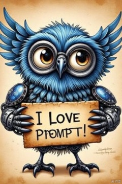Blueprint on parchment,A detailed detailed illustration of a bird holding a sign that reads "I LOVE PROMPTS!" in bold black letters. The bird's feathers are a vibrant blue,and the bird's beak is a dark gray,while its wings are a lighter blue. The owl's feet are black,and its claws are a darker gray. The background of the owl is a light brown