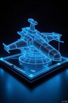 Holographic projection,a 3D model of a spaceship is lit up in a vibrant blue hue. The model is set against a dark backdrop,with a black surface beneath it. The spaceship is made up of a series of thin wire mesh