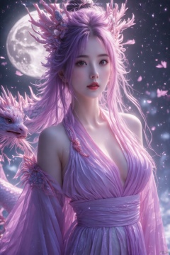 Masterpiece, best quality, ultra-detailed photography of a beautiful girl with slanted phoenix eyes, snow-white Luo Shang glowing under moonlight, tightly tied body showcasing exquisite lines and slender legs peeking from under her skirt. Long pink-purple hair flows like a waterfall, pink neck exposed, spring mountain brows, big black eyes shining, arched nose, seductive red lips with a beauty mark, dimples on cheeks. Fair skin radiates youthful vitality, unparalleled figure with slender waist and丰满breasts. HD, 32k, 8k, super clean, xihua.