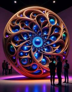 A stunning retro-style sculpture made from walnut wood with a complex fractal design, showcased in a sleek New York gallery. The smooth, mid-century curves of the walnut wood are intricately carved into repeating geometric patterns, with shimmering blue glass elements embedded throughout. The blue glass catches the gallery’s spotlight, reflecting light in vibrant, cool tones against the warm, rich walnut surface. Neon purple, green, and orange LED lights surround the sculpture, casting an ethereal glow and creating dynamic reflections off the glass and wood. Shadowy figures of gallery visitors stand nearby, their silhouettes subtly illuminated by the colorful lights as they gaze at the mesmerizing blend of retro artistry and modern materials<lora:ral-frctlgmtry_flux:0.8> ral-frctlgmtry <lora:woodfigurez:0.8> woodfigurez