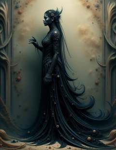 A solitary female ral-frctlgmtry figure, swathed in an impeccably rendered panoply of dark, painterly hues, stands against an ethereal, texturally rich backdrop<lora:ral-frctlgmtry_flux:1>