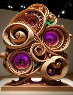 A stunning wood sculpture with a complex fractal design displayed in a sleek New York gallery. The sculpture features intricate, repeating patterns of spirals and geometric shapes, crafted entirely from smooth, polished wood. Its organic, yet mathematically precise design reflects the beauty of natural fractals. The gallery's spotlight highlights the structure, casting shadows that emphasize its intricate detail. The sculpture is illuminated by neon purple, green, and orange LED lights, embedded within the wooden forms, creating a mesmerizing glow that enhances the futuristic vibe. The vibrant neon colors reflect off the polished wood, giving the sculpture a dynamic, almost ethereal presence in the space<lora:ral-frctlgmtry_flux:0.8> ral-frctlgmtry <lora:woodfigurez:0.8> woodfigurez