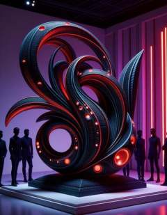 A captivating retro-style sculpture made of dark wood with a complex fractal design is displayed in a sleek New York gallery. The sculpture features smooth, mid-century inspired curves, with intricate geometric patterns embedded with glowing red gemstones. A focused spotlight highlights the piece, casting deep shadows that emphasize its rich texture. Surrounding the sculpture, neon purple, green, and orange LED lights create a futuristic yet nostalgic glow, reflecting off the polished wood and radiant gems. Shadowy figures of gallery visitors stand nearby, their outlines softly illuminated by the colorful lights, silently observing the mesmerizing blend of retro and futuristic design, adding a sense of mystery and intrigue to the scene<lora:ral-frctlgmtry_flux:0.8> ral-frctlgmtry <lora:woodfigurez:0.8> woodfigurez