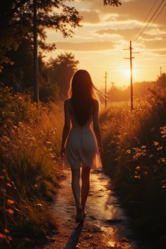 breathtaking Silhouette Art, long shot scenic professional photograph of a high-resolution anime-style photograph capturing a serene golden hour scene in a rural setting. The central subject is a young woman walking away from the camera, her silhouette backlit by the sun, casting a warm glow over her figure. She has a slender physique with long black hair that appears slightly tousled by the breeze. She wears a light-colored sleeveless dress that billows around her legs, suggesting a gentle wind.