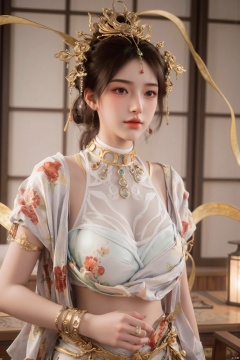 Realistic photos, 1girl, fair skin, (big breasts:1.39), oiran headdress, (wearing Japanese kimono), beautiful and sexy, upper body, Japanese scene,