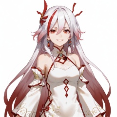 (white background:1.2),looking at viewer,(SOLO:1.4),outline,simple background,upper body, cowboy shot,looking at viewer,(((arms at side))),  fu hua, long hair, bangs, hair ornament, red eyes, hair between eyes, white hair, multicolored hair, streaked hair, smile, small breasts, red hair, pink hair,low-tied long hair,jewelry,high heels,detached sleeves,dress,bare shoulders,long sleeves,wide sleeves,gem,white dress,china dress,very long hair<lora:wszy-pony:0.8>