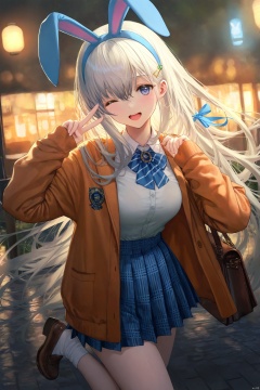 one eye closed, open mouth, jacket, skirt, v, blush, heart, smile, shirt, long sleeves, plaid skirt, plaid, ;d, sleeves past wrists, pleated skirt, (outdoors, bokeh, blurry background), hand up, open jacket, standing, standing on one leg, leg up, socks, loafers, open clothes,