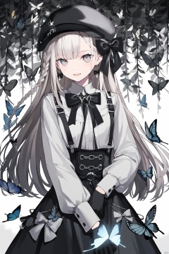 1girl, black_bow, black_skirt, bow, braid, bug, butterfly, earrings, full_body, gloves, hair_bow, hat, jewelry, long_hair, long_sleeves, looking_at_viewer, open_mouth, ribbon, shirt, skirt, smile, solo, standing, suspenders, white_shirt