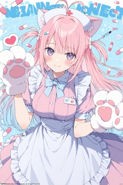 1girl, animal_hands, antenna_hair, apron, blush, bow, bowtie, breasts, closed_mouth, copyright_name, dress, eyebrows_visible_through_hair, frills, gloves, heart, long_hair, looking_at_viewer, multicolored_hair, nurse, paw_gloves, pill, pink_dress, pink_hair, short_sleeves, smile, solo, syringe, two_side_up, waist_apron, white_apron