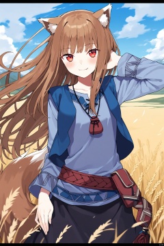 1girl, holo, animal_ears, long_hair, solo, brown_hair, wolf_ears, outdoors, sky, red_eyes, letterboxed, field, wheat, fang, looking_at_viewer, wolf_girl, cloud, day, smile, hand_in_own_hair, vest, blue_sky, shirt, blush, pouch