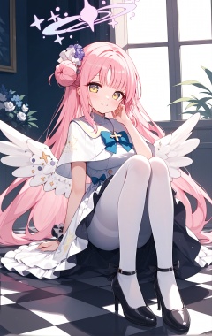 (score_9,score_8_up,score_7_up), (masterpiece),( beautiful),(high quality),(finely detailed),extremely detailed CG unity 8k wallpaper,best quality,1girl, solo, long hair, looking at viewer, blush, smile, bangs, hair ornament, dress, bow, sitting, very long hair, closed mouth, yellow eyes, pink hair, flower, pantyhose, frills, wings, indoors, hair flower, hair bun, black footwear, white dress, high heels, head tilt, capelet, halo, blue bow, scrunchie, frilled dress, feathered wings, knees up, white pantyhose, angel wings, on floor, white wings, single side bun, low wings, wrist scrunchie, tile floor, checkered floor, white capelet, pumps, mika \(blue archive\),mikaBA, chair