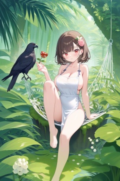 1girl,solo,best quality,detailed,looking at viewer,standing on one leg,sitting,blush,tanabata,tanzaku,parted lips,red eyes,brown hair,short hair,medium hair,hair ornament,bangs,large breasts,innerboob,cleavage,collarbone,leg up,thighs,bare legs,barefoot,white dress,bare shoulders,pelvic curtain,vines,outdoors,high heels,potted plant,palm tree,grass,branch,palm leaf,ivy,jungle,bare tree,garden,thorns,animal,lily \(flower\),mushroom,foliage,bird on hand,watering can,moss,hammock,bare arms,crow,flower pot,overgrown,parrot,bamboo forest,lily pad,bush,tree stump,knee up,ladybug,deer,lily of the valley,cattail,seaweed,skeleton,pond,pink rose,