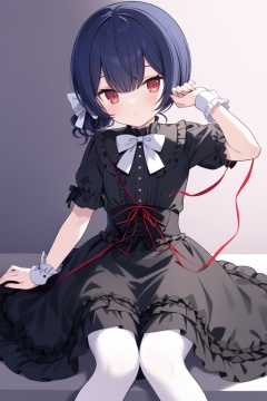 1girl, morino_rinze, solo, red_eyes, wrist_cuffs, looking_at_viewer, string, string_of_fate, bow, lolita_fashion, dress, frills, gothic_lolita, hair_bow, sitting, black_dress, white_bow, black_hair, white_pantyhose, frilled_dress, arm_up, blood, closed_mouth, pantyhose, blue_hair, bowtie