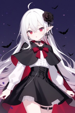 1girl,black_flower,black_rose,solo,white_hair,pointy_ears,long_hair,flower,red_eyes,hair_flower,skirt,hair_ornament,long_sleeves,jewelry,looking_at_viewer,earrings,rose,shirt,white_shirt,capelet,black_skirt,black_capelet,bat_\(animal\),thigh_strap,choker,ahoge,high-waist_skirt,hair_between_eyes,cross,cross_earrings,petals,black_choker,cowboy_shot,vampire,