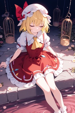 1girl, flandre scarlet, solo, best quality, aesthetic, feet out of frame, sitting, holding, closed eyes, blonde hair, blood, mob cap, red dress, white socks, hat bow, white shirt, puffy short sleeves, frills, red ribbon, wings, birdcage, white headwear, red bow, flower, yellow ascot, wrist cuffs, water