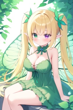 1girl, breasts, heterochromia, pointy_ears, solo, green_eyes, blonde_hair, cleavage, long_hair, wings, large_breasts, dress, green_dress, hair_ornament, sitting, blush, fairy_wings, purple_eyes, fairy, bare_shoulders, twintails, flower, closed_mouth, leaf