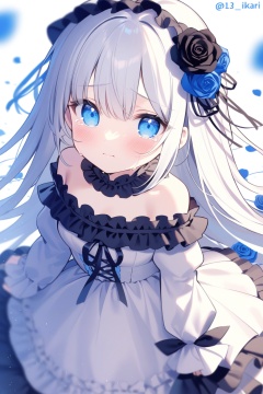 1girl, solo, rose, black_flower, dress, flower, black_rose, long_hair, blue_rose, blue_eyes, frills, blue_flower, bare_shoulders, white_dress, white_background, tears, blush, hair_flower, hair_ornament, closed_mouth, very_long_hair, looking_at_viewer, white_hair, twitter_username, off_shoulder, frilled_dress, blurry, off-shoulder_dress, crying_with_eyes_open, simple_background, sleeves_past_wrists