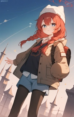 (score_9,score_8_up,score_7_up), (masterpiece),( beautiful),(high quality),(finely detailed),extremely detailed CG unity 8k wallpaper,best quality,1girl, solo, long hair, looking at viewer, blush, bangs, blue eyes, shirt, long sleeves, hat, hair between eyes, jacket, braid, pantyhose, red hair, outdoors, parted lips, open clothes, necktie, shorts, puffy sleeves, collared shirt, bag, twitter username, twin braids, open jacket, black pantyhose, black shirt, short shorts, white headwear, halo, backpack, red necktie, puffy long sleeves, blue shorts, brown jacket, beanie, notice lines, legwear under shorts,makiBA