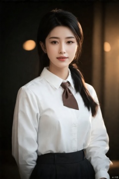 (best quality,4k,8k,highres,masterpiece:1.2),ultra-detailed,(realistic,photorealistic,photo-realistic:1.37),white long-sleeved shirt,dark collar,brown tie,plain dark background,warm soft glow,highlights attire,a asian woman wearing formal attire,professional portrait,studio lighting,sharp focus,extreme detail description,physically-based rendering,vivid colors,bokeh,modern fashion,smart casual,neat and tidy,confident expression,slight smile,standing pose,front view,subtle shadows,smooth fabric texture,refined style,contemporary art,HDR,UHD