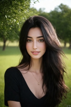 (best quality,4k,8k,highres,masterpiece:1.2),ultra-detailed,(realistic,photorealistic,photo-realistic:1.37),long wavy dark hair,black top,outdoor setting,natural lighting,daytime,beautiful detailed eyes,beautiful detailed lips,extremely detailed eyes and face,long eyelashes,serene expression,standing pose,slight smile,green grass background,trees in the distance,soft shadows,gentle breeze,flowing hair,relaxed atmosphere,soft sunlight,calm and peaceful,photography,realistic colors,clear sky,shallow depth of field,vivid colors,bokeh,dynamic range,HDR