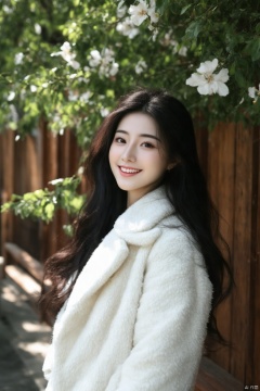 (best quality,4k,8k,highres,masterpiece:1.2),ultra-detailed,(realistic,photorealistic,photo-realistic:1.37),white fluffy coat,long dark hair,wooden background,sunny day outdoors,beautiful detailed eyes,beautiful detailed lips,extremely detailed eyes and face,long eyelashes,smiling gently,standing gracefully,soft sunlight,gentle breeze,green leaves,flowers in the background,calm and serene expression,flowing hair,relaxed posture,soft shadows,cozy atmosphere,warm colors,natural lighting,bokeh,sharp focus,physically-based rendering,extreme detail description,professional,vivid colors,summer vibe